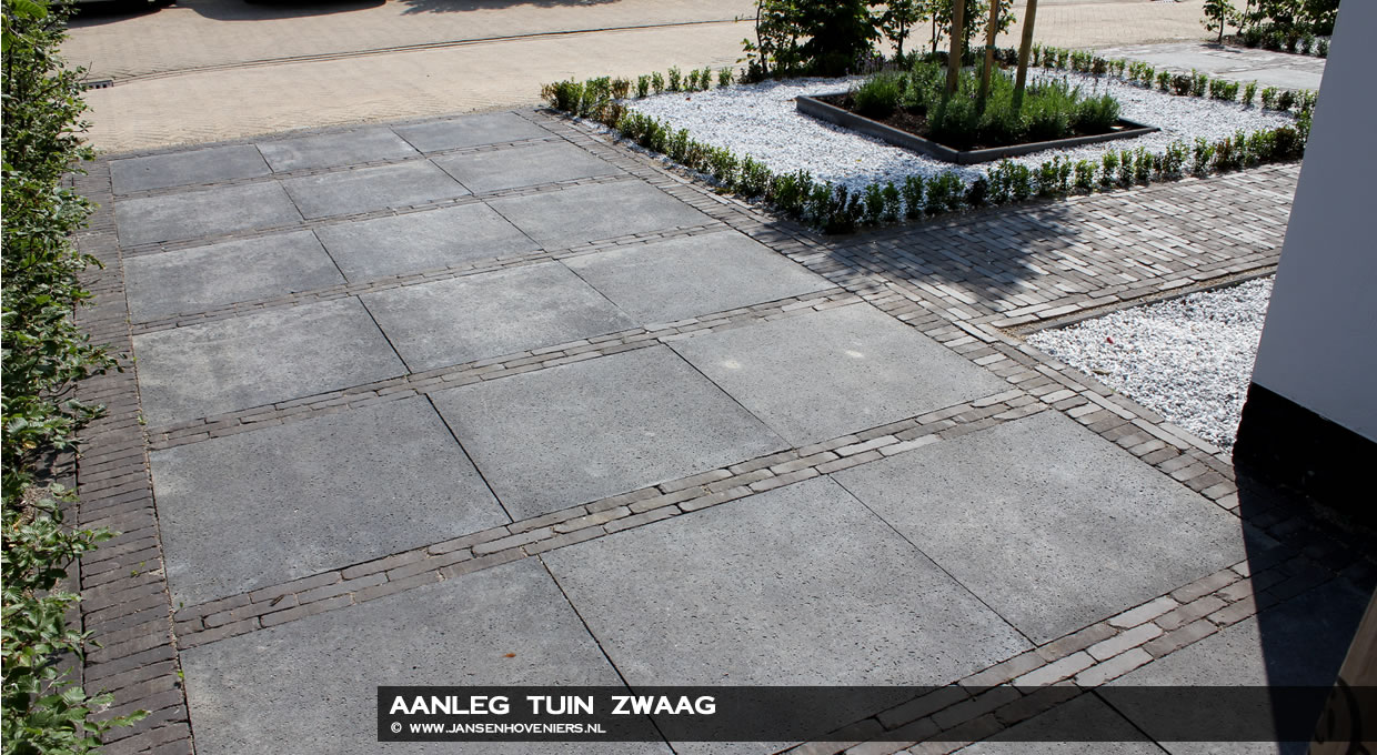 Voor de voortuin is er gekozen voor statige uitstraling met veel strakke lijnen. De sierbestrating bestaat uit gebakken waalformaat antraciet met schellevis tegels antraciet 80x80cm. De vakken aan de voorkant zijn bedekt met arctic grey split (icy blue) en voorzien van een buxushaag voor het contrast.