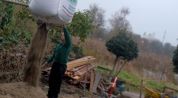 Het zand hebben wij in big bags aangeleverd en via de torenkraan boven de tuin geleegd, waardoor wij zeer snel de tuin bedekt hadden met zand. Tevens konden we hierdoor snel de oude materialen afvoeren zonder overlast in de woning te veroorzaken.