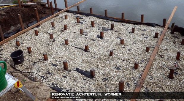 Het huis werd grondig verbouwd en de tuin kon niet achterblijven. De gehele tuin is leeg geruimd inclusief twee grote bomen, en er is begonnen met ophogen en herbestraten van het terras tegen de woning. Vervolgens hebben wij de oude vlonder gedemonteerd en een nieuwe beschoeiing aangebracht aangezien de oude rot was.
