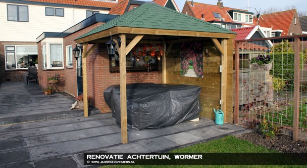 Als laatste hebben wij midden in de tuin een prieel van Woodvision geplaatst om een prachtige zitplek te creëren waar er genoten kan worden van de gehele tuin en om te kunnen genieten van het prachtige uitzicht. Om de Kliko’s uit het zicht te hebben, is er een container kast van Woodvision aangebracht, waardoor er geen storende elementen in de tuin staan.