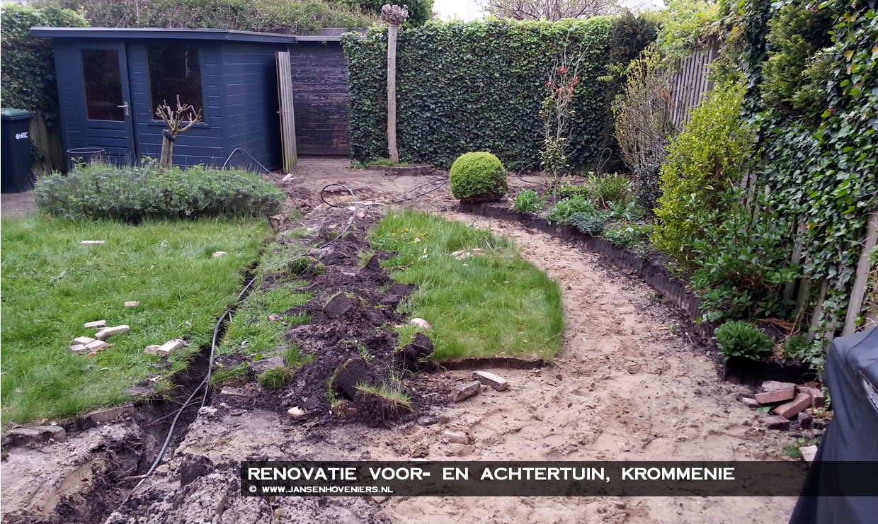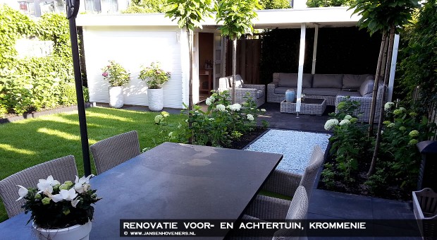 De voortuin is in dezelfde stijl als de achtertuin gemaakt, alleen met 30x60cm tegels en verhoogde borders om de ruimte meer te kunnen gebruiken. Door de gedane renovatie in de voor- en achtertuin hebben de bewoners een prachtige tuin om heerlijk te kunnen genieten op beide terrassen.