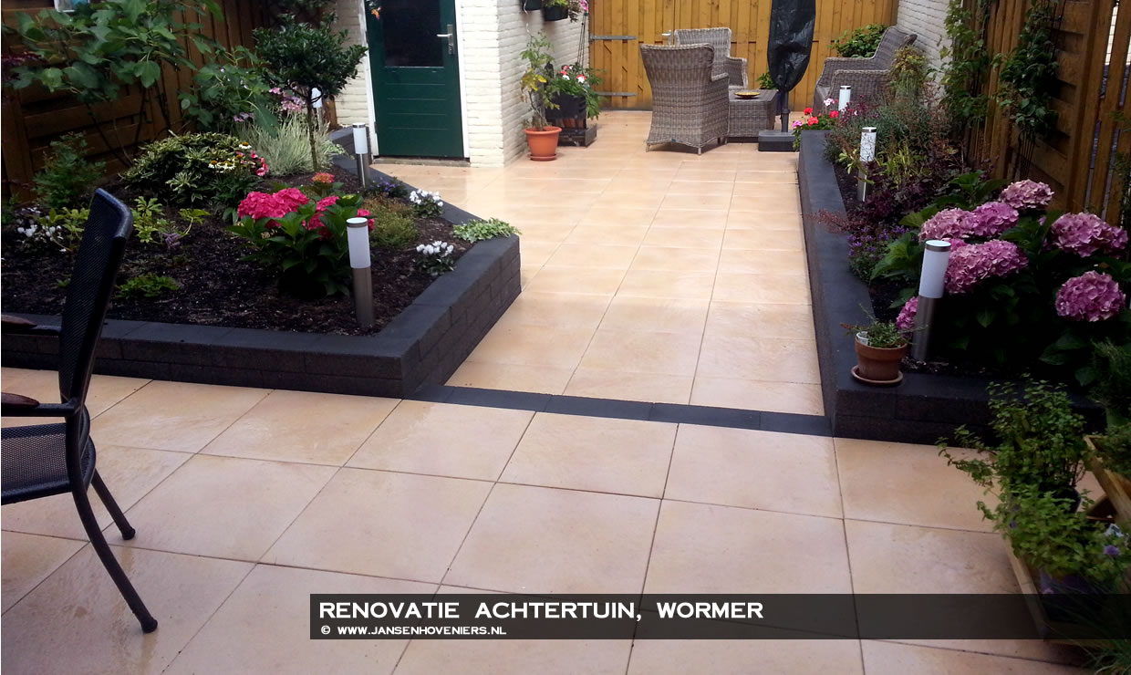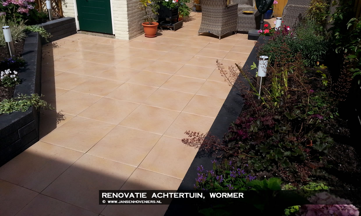 De bewoners wilde graag van de saaie grijze betontegels af die al heel lang in de achtertuin lagen. De wens was een gele tegel te gebruiken die gemakkelijk te onderhouden zou zijn en gezien de leeftijd van de bewoners moest de tuin een stuk onderhoudsarmer worden.
