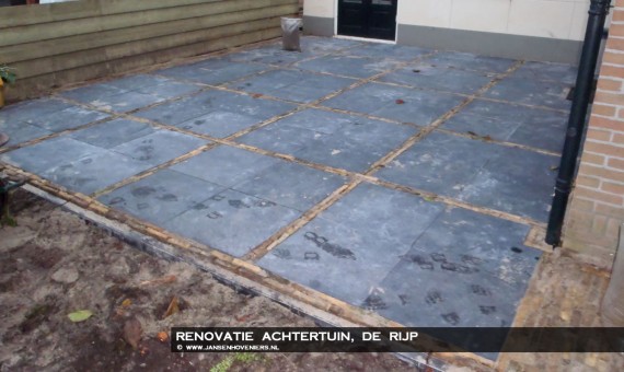 Voor het terras hebben wij grotendeels gebruikt gemaakt van de aanwezige “authentieke geeltjes”, dit is een pracht klinker die wij gecombineerd hebben met een zwarte leisteen tegel in het formaat 60×60 centimeter. Door deze combinatie lijkt het terras een stuk groter en is het onderhoudsvriendelijker geworden, zonder dat het misstaat bij de woning/omgeving.